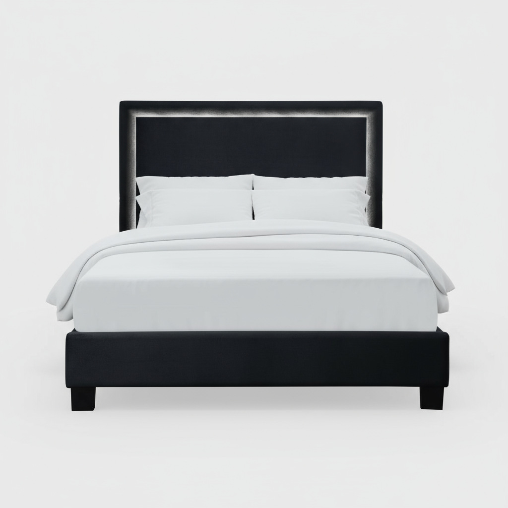 Improve your bedroom's ambiance with the Lumina Grey Velvet Bed. The minimalist design, grey flannelette upholstery, and built-in LED lighting make it a versatile and convenient option for any room. With a platform design, there's no need for a box-spring or foundation. Experience a brighter and more comfortable sleep with Lumina.