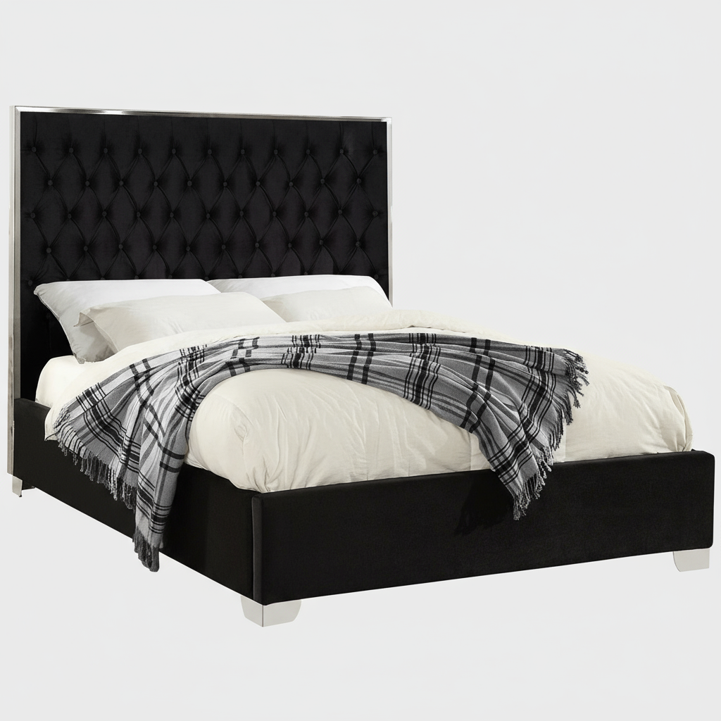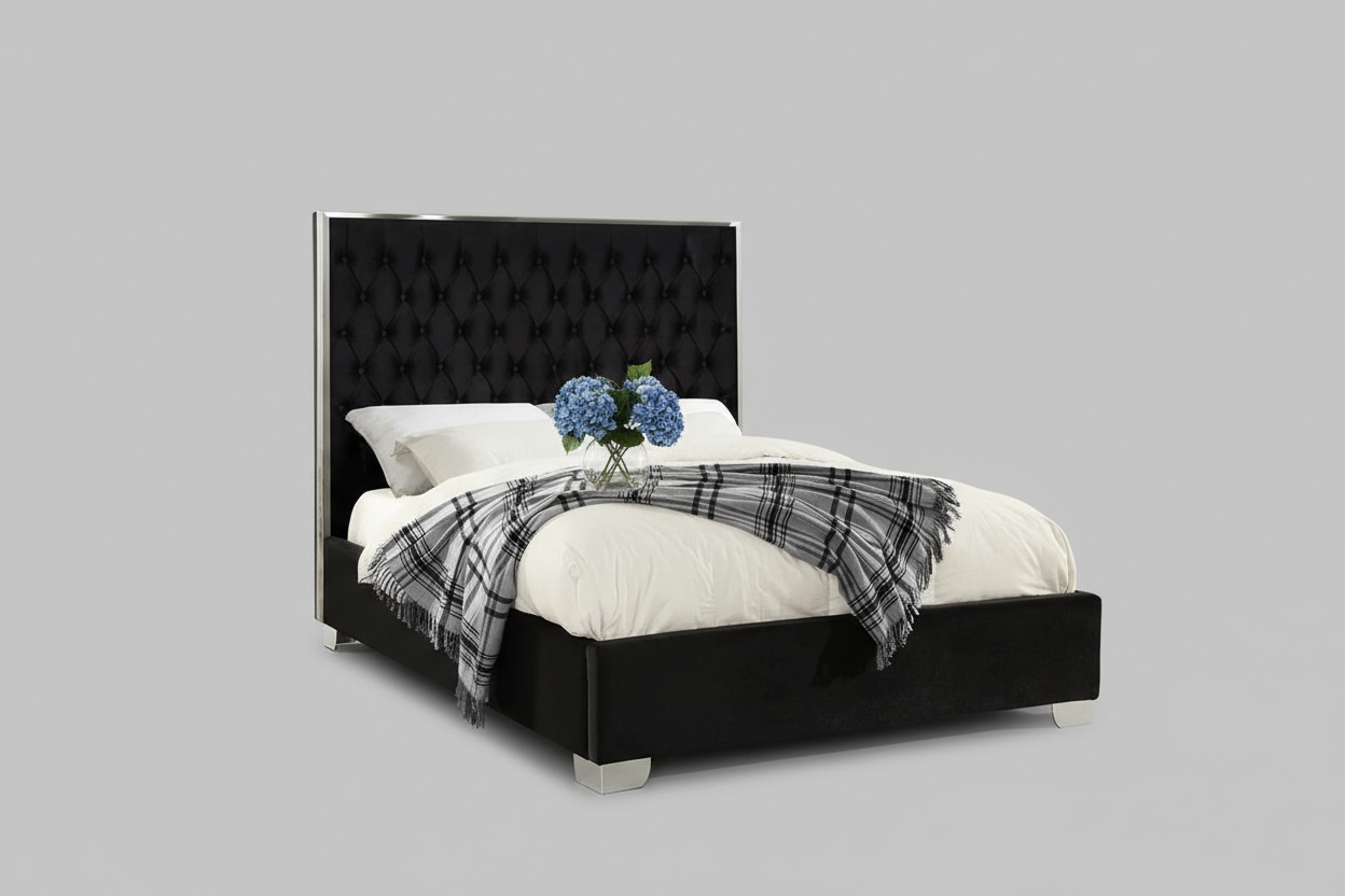 The Violet Grey Queen Platform Bed combines opulence and modern design with its rich black velvet upholstery and sleek chrome frame. Measuring 87" deep, 66" wide, and featuring a 55" high headboard, this bed provides a commanding presence in any bedroom. The 11" clearance under the rails and footboard offers practical storage space while maintaining a clean, open look. Supported by 2" high legs, the platform ensures sturdy stability without the need for a box spring. This bed seamlessly blends durability, style, and comfort, making it an ideal choice for a sophisticated and functional sleeping environment.