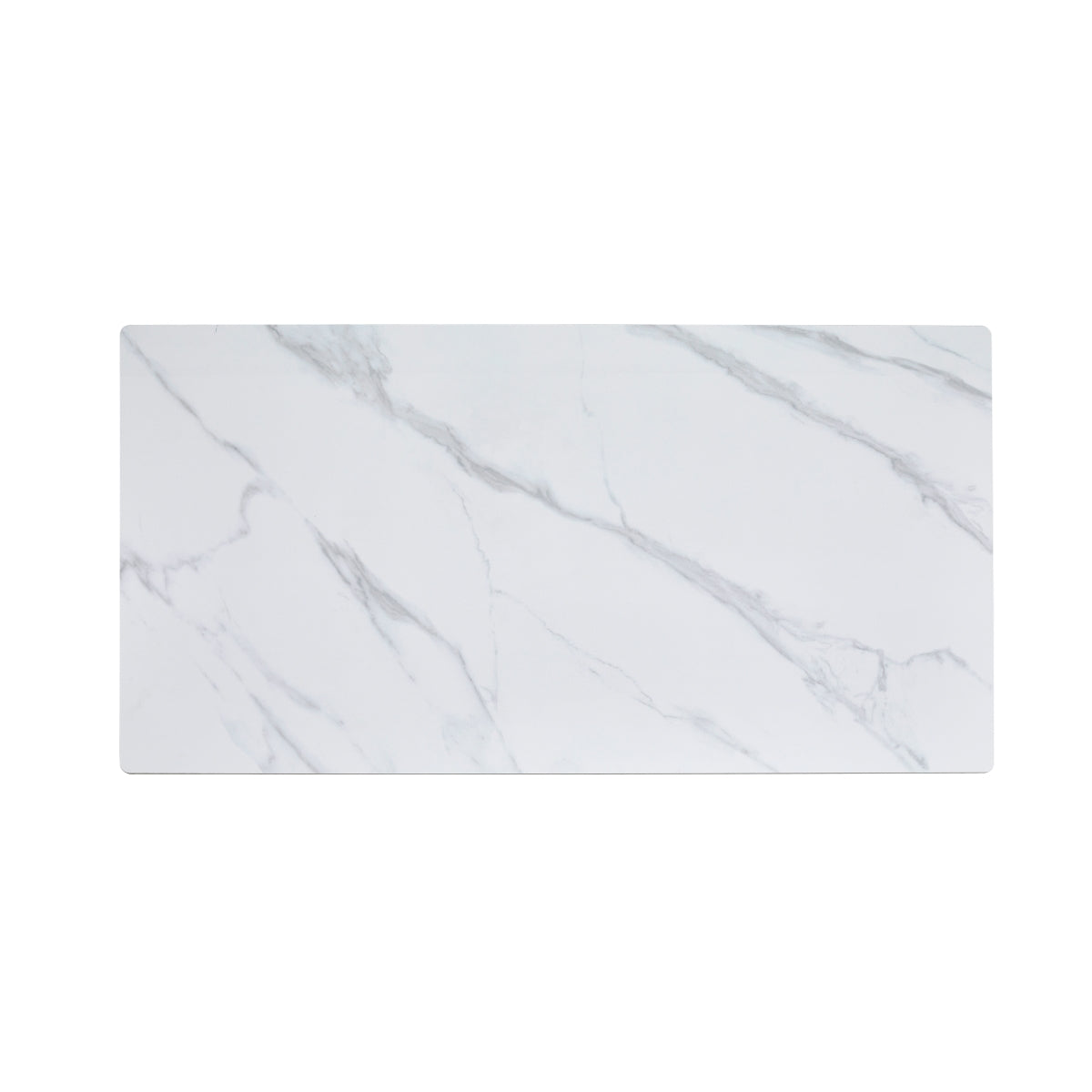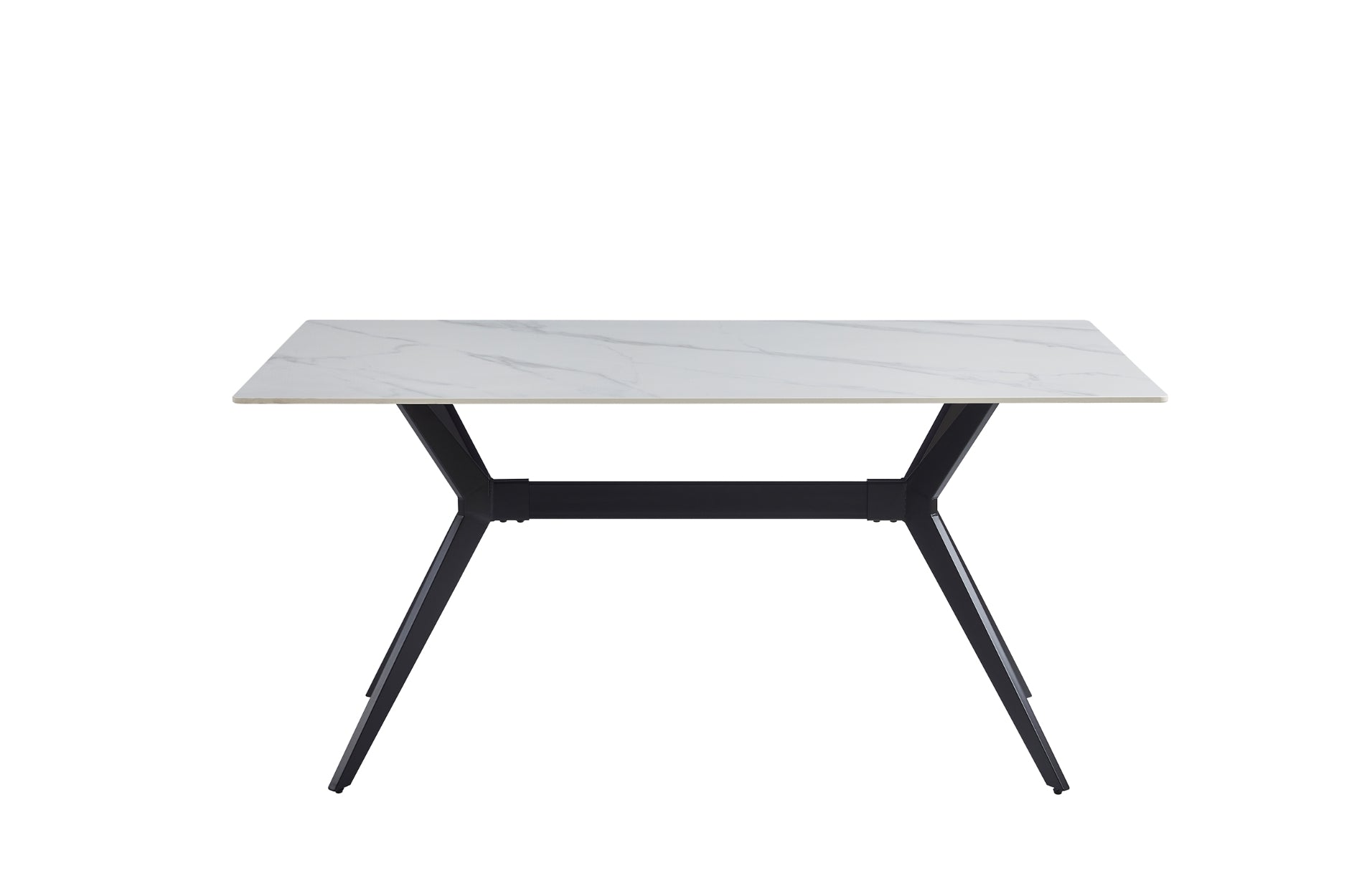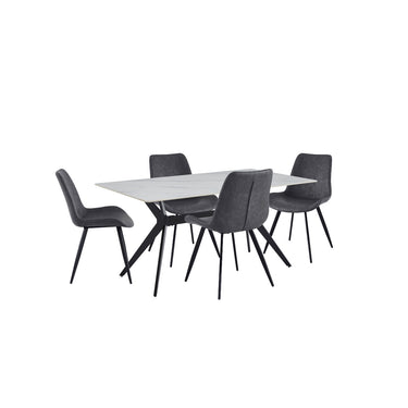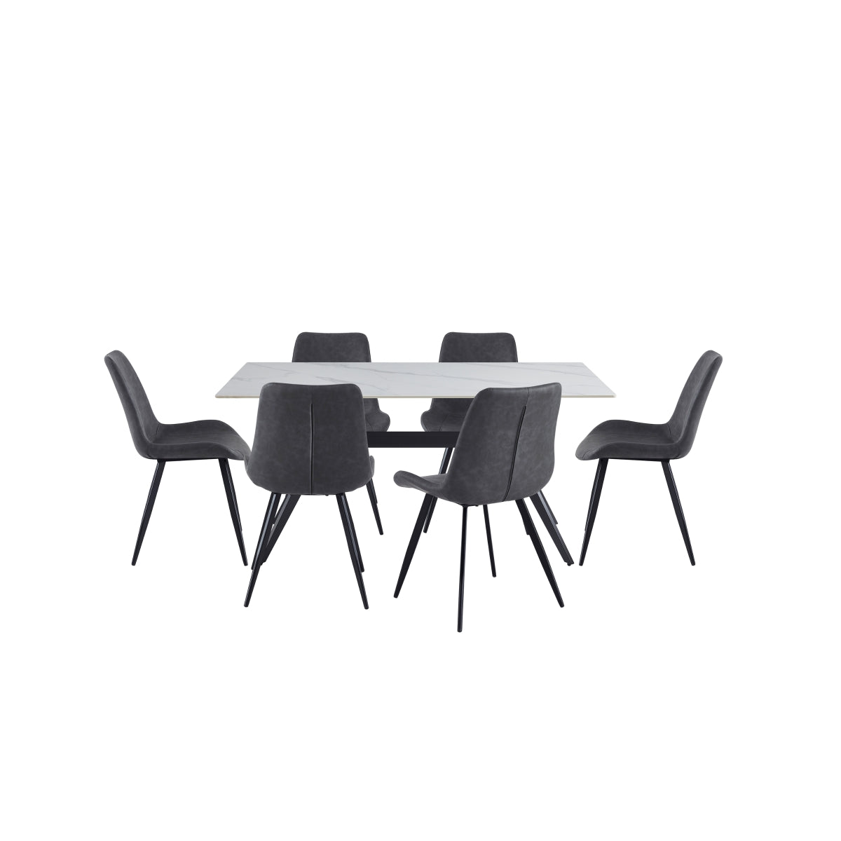 The Dumas Dining Set combines the timeless look of white marble with a modern design, featuring a durable sintered stone tabletop that resists scratches, stains, and heat. Its angled black metal trestle base adds architectural style, while the grey faux leather chairs offer comfortable, supportive seating. Perfectly sized for everyday living, this set blends elegance and practicality to enhance your dining space.