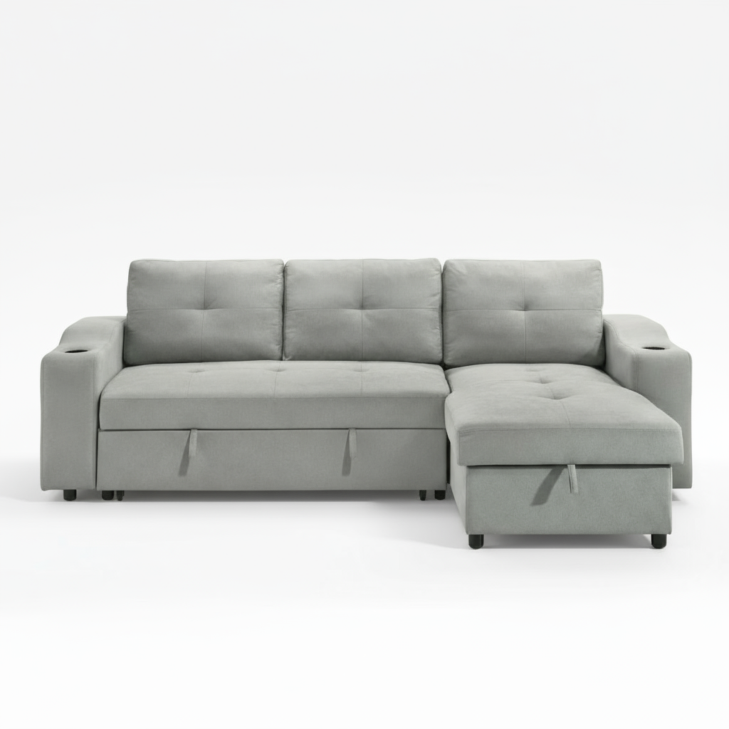 Dive into cozy modern vibes with the Decker Collection! This clever 2-piece sofa and chaise combo is all about comfort and smart design. Flip the chaise to either side of the loveseat to fit your space just right. Need extra storage? The chaise’s lift-top hides away your books, blankets, or pillows. Sip in style with built-in cupholders nestled in the scroll arms, and stash your magazines or gadgets in the handy side pockets. When it’s time to chill or host, the loveseat pulls out into a comfy sleeper. Wrapped in soft grey fabric with cute biscuit tufting, the Decker is your new living room superstar!