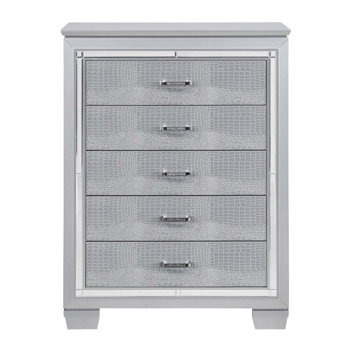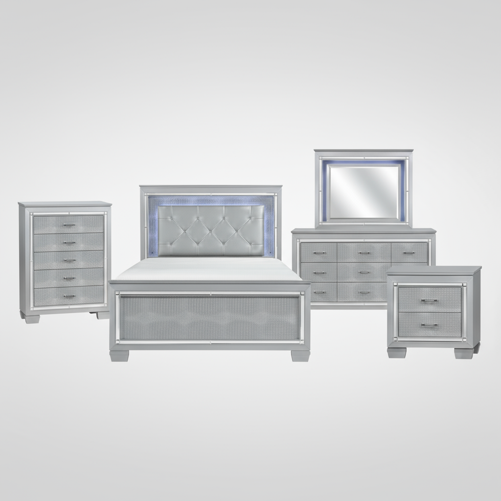 The Allura Bedroom Set features a sophisticated design highlighted by beveled mirror accents that amplify the glow from the touch-activated LED backlighting on the headboard and mirror, as well as the nightstand’s under-lighting. Its silver finish is complemented by alligator embossing and polished crystal-enhanced hardware, while the silver faux leather crystal-tufted headboard insert adds refined texture and elegance to the ensemble. This set combines style and subtle illumination to create a glamorous bedroom experience.