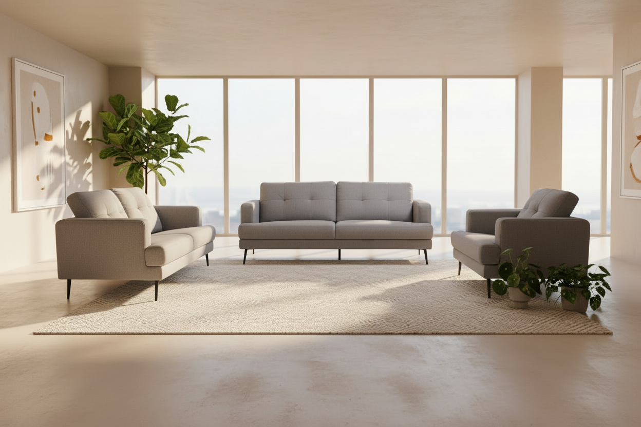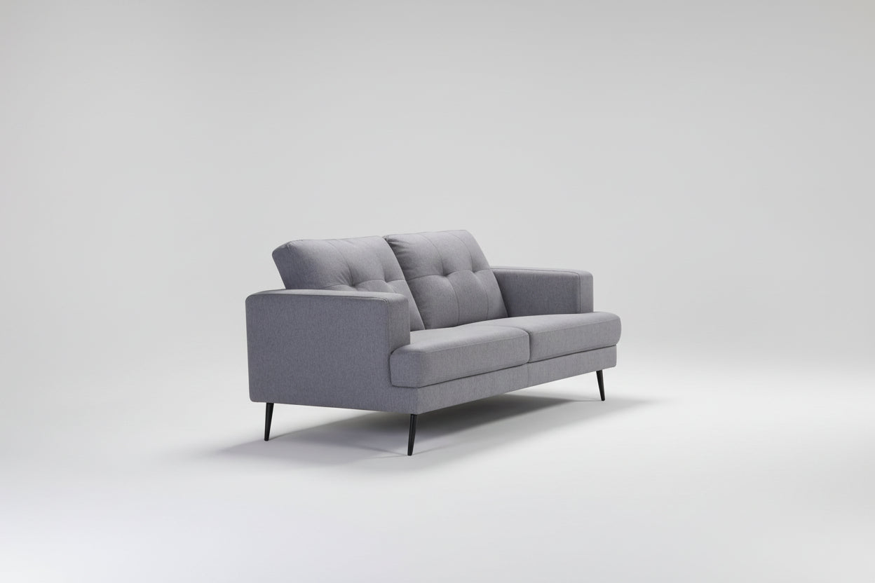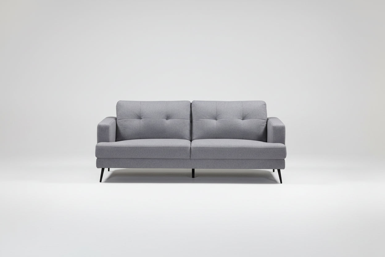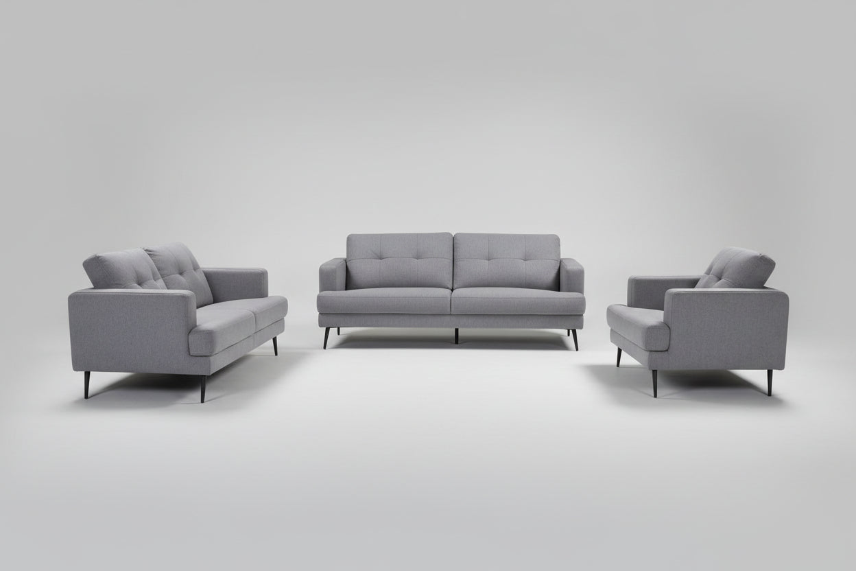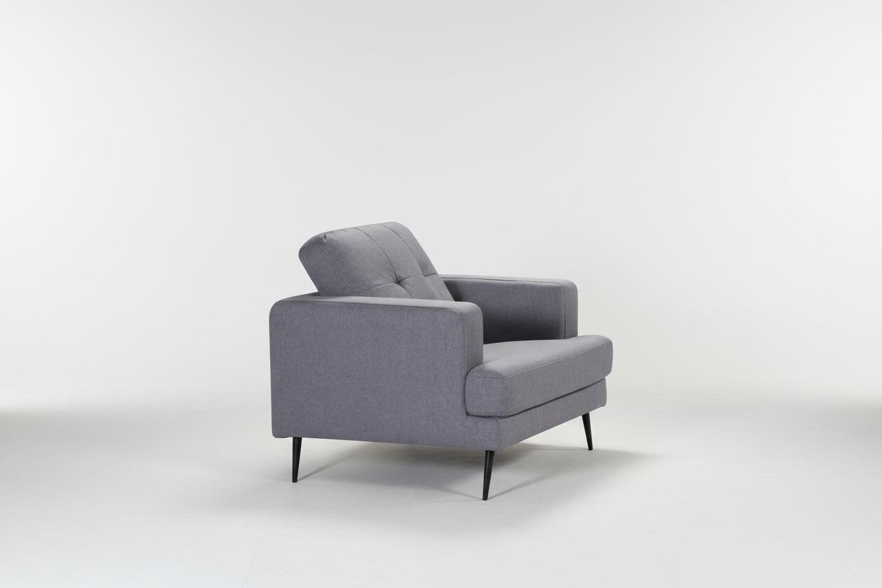 Mid-century design with traditional accents brings together the refined Avery seating collection. The tufted back cushions and tapered black legs compliment the fresh grey linen-like fabric perfectly for a clean, elegant appearance. The neutral palette allows this stylish collection to pair perfectly with your living room décor.