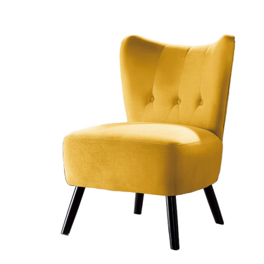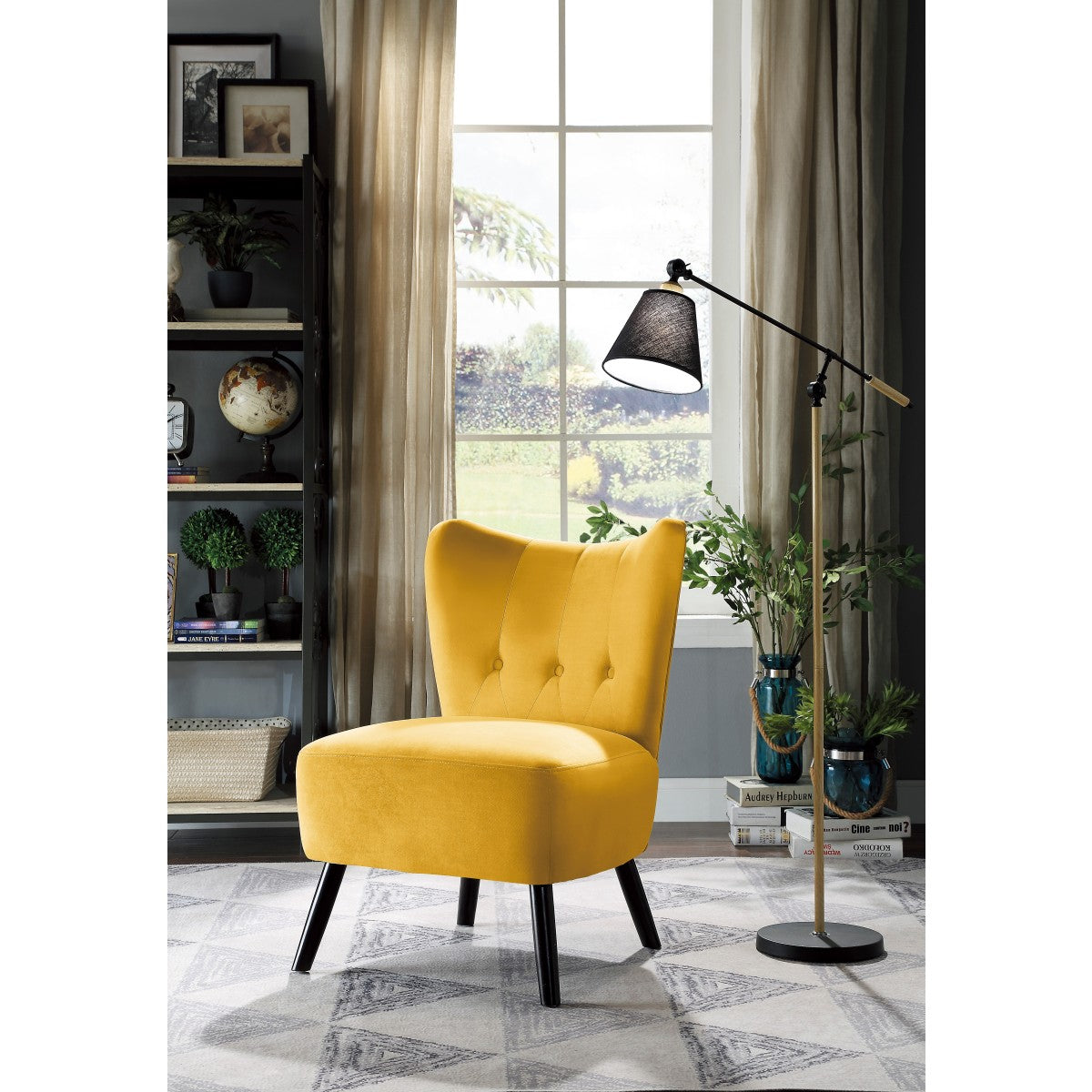 The Imani Accent Chair brings a vibrant, retro-inspired touch to modern interiors with its bold yellow velvet upholstery. Designed for style and comfort, it features contoured shapes, button accents, and sturdy dark brown wood legs. This standout piece complements contemporary décor while offering durability and visual appeal. Available in green, red, gray, and orange velvet, the Imani Collection provides versatile options to enhance any space with a distinctive flair.