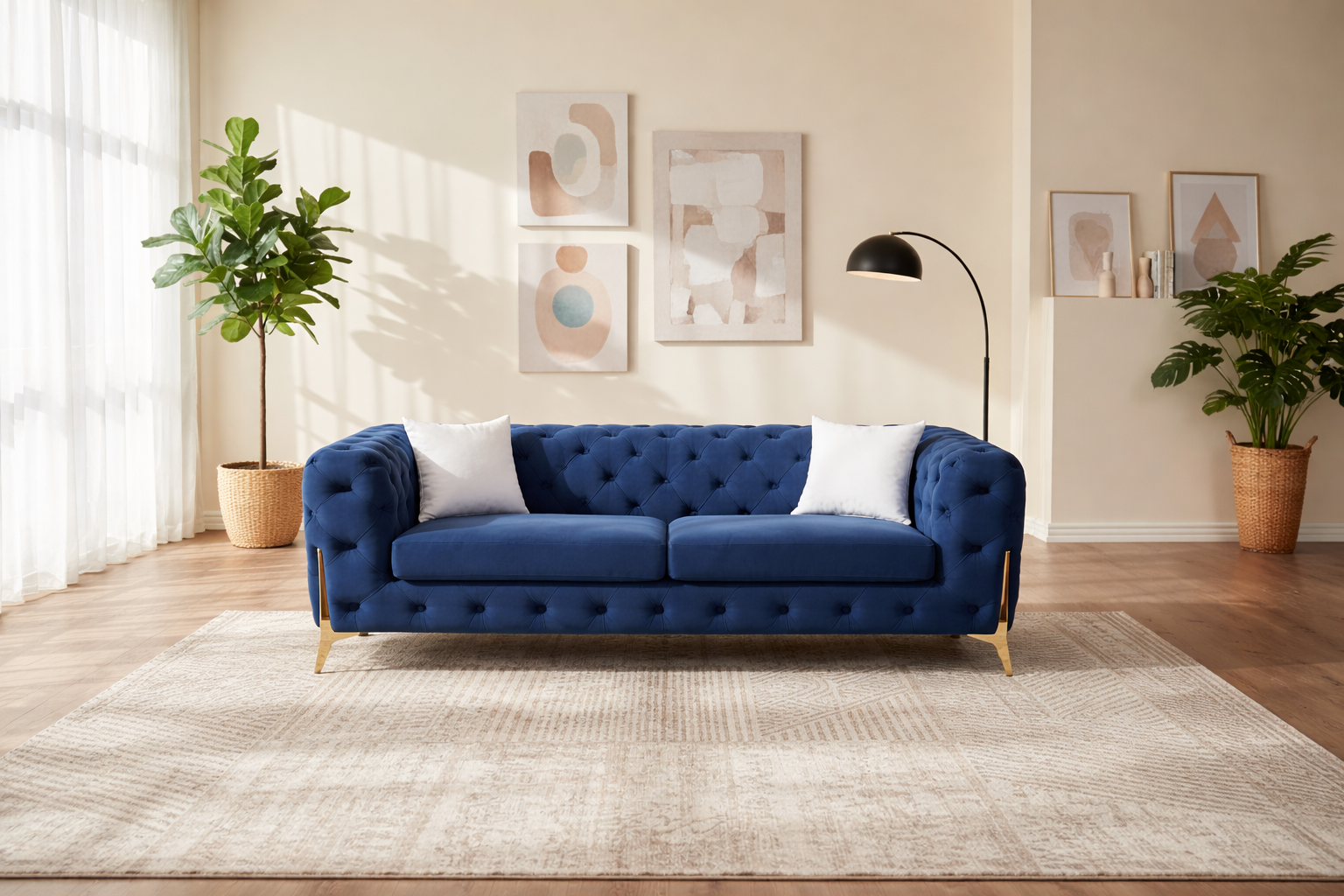 The Alexa Collection Chesterfield seating group combines timeless style with contemporary appeal. Upholstered in neutral blue fabric, it features elegant rhinestone tufting and refined nail head trim. The generous proportions deliver exceptional comfort, while the detailed arms flow seamlessly into the back for a cohesive, sophisticated look that suits both modern and traditional interiors.