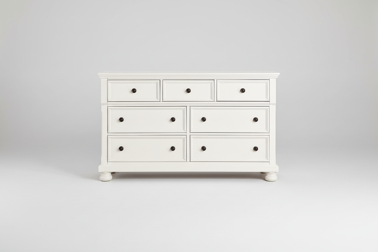 The Laurelin dresser brings refined versatility to any bedroom with its clean white finish and timeless design elements. Framed drawer fronts paired with antiqued bronze hardware create visual interest, while sturdy bun feet ground the piece with classic appeal. A concealed drawer offers discreet storage for personal items, making this dresser equally at home in traditional or country casual settings. Sophisticated yet adaptable, it's the perfect foundation for a curated bedroom aesthetic.