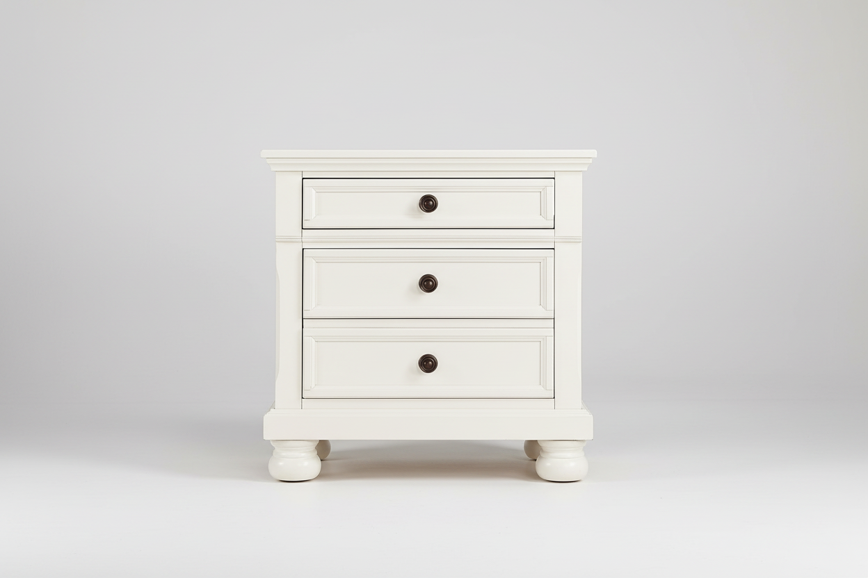 The Laurelin nightstand epitomizes refined elegance with its pristine white finish and carefully curated design details. Antiqued bronze hardware accents each framed drawer front, while substantial bun feet provide sturdy support and visual grounding. This versatile piece transitions effortlessly between traditional and country casual interiors, making it an ideal choice for diverse bedroom settings. Beyond its polished exterior, the nightstand features a concealed drawer—perfect for securing jewelry and other treasured valuables with discretion and style.