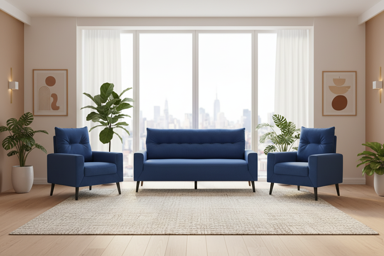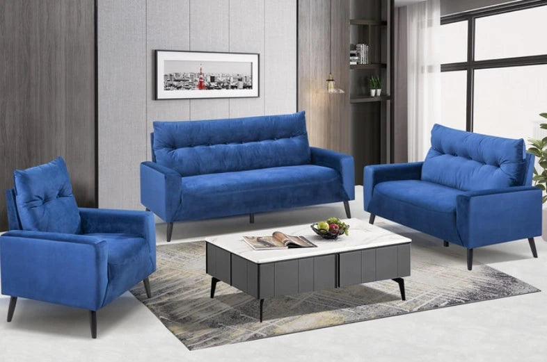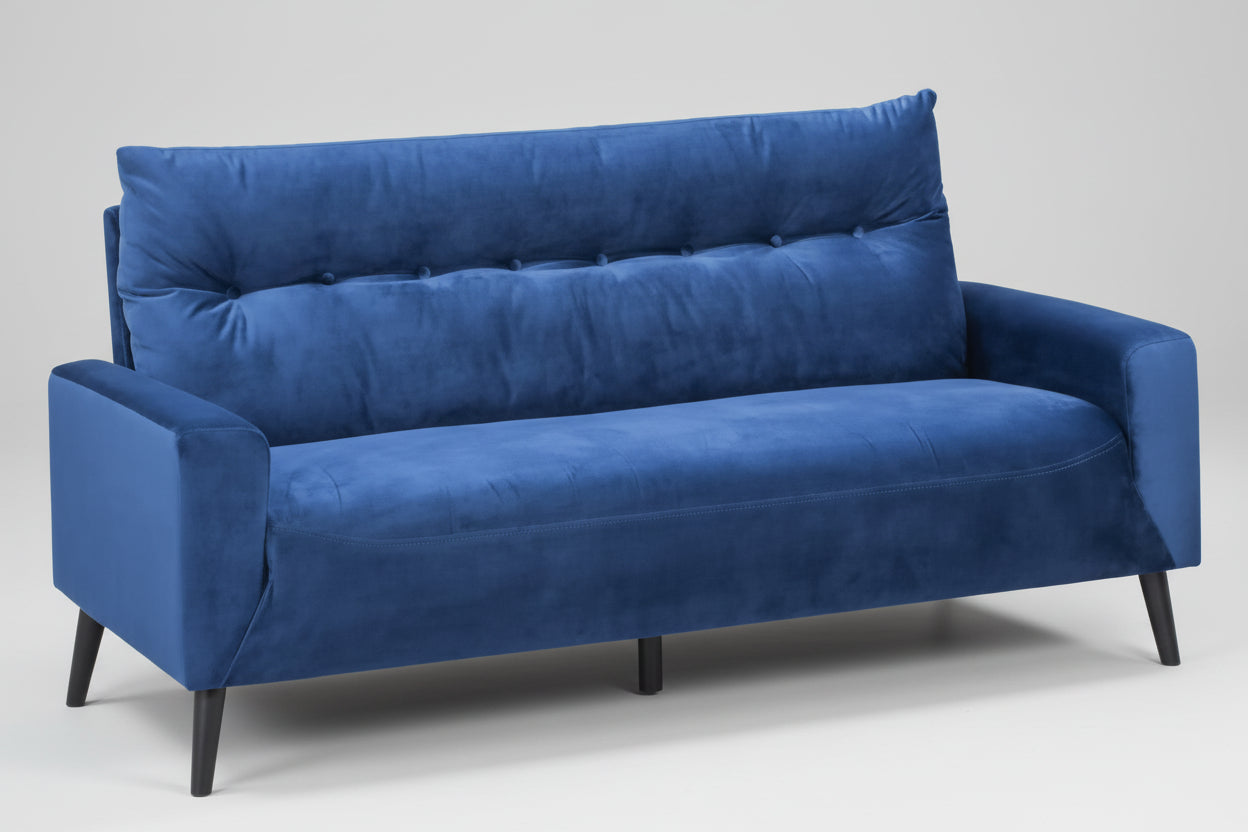 Veronica is a Mid-Century Modern accent chair featuring plush navy velvet upholstery with elegant button tuft detailing. Its low square arms, exposed angled legs, and fixed tight back deliver timeless sophistication. Built with high resilience foam and a sturdy hardwood frame, this piece combines comfort with refined style.